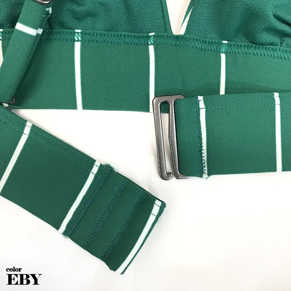 ・トップスの幅広のアンダーバストデザインでしっかりとバストをホールドするストライプ柄のVネックビキニ