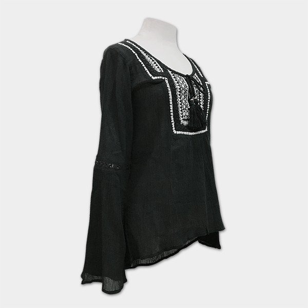 ・ベルスリーブと、スラッシュ開きのネックラインが女性らしく