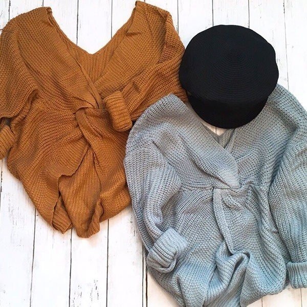 女性ディープvネック背中の開きセーター可逆長袖結び目セクシーニットトップス BD18-O031