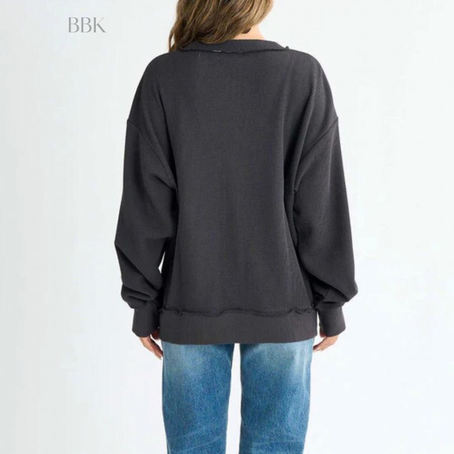 ・端の始末をカットオフに仕上げ、裾と袖のリブの上にはステッチワークをミックスしたカジュアルなデザイン。