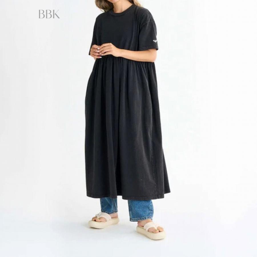 RDR251092 ロキシー ロングワンピース レディース 通販 新作 人気 女性 半袖 かわいい おしゃれ ギフト プレゼント オーバーサイズ 黒 白 ロゴ ROXY