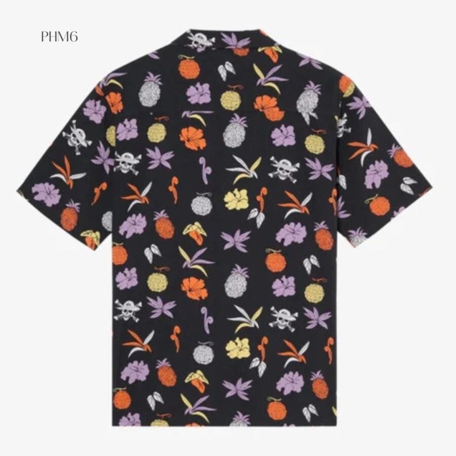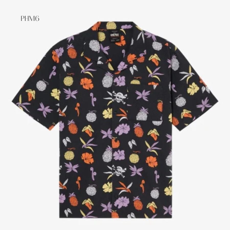 ・作品を象徴する「悪魔の実」を南国風のボタニカル柄に落とし込んだユニークな総柄デザインが目を引く一着。素材には肌触りの良いコットン100%を採用しており、快適な着心地を提供する。
