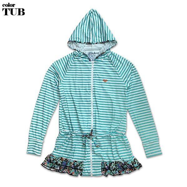 RLY141051 ロキシー ラッシュガード レディース パーカー フーディー 長袖 ジップアップ UPF50+ UV 紫外線対策 日焼け対策 ターコイズ ボーダー柄 フリル ROXY