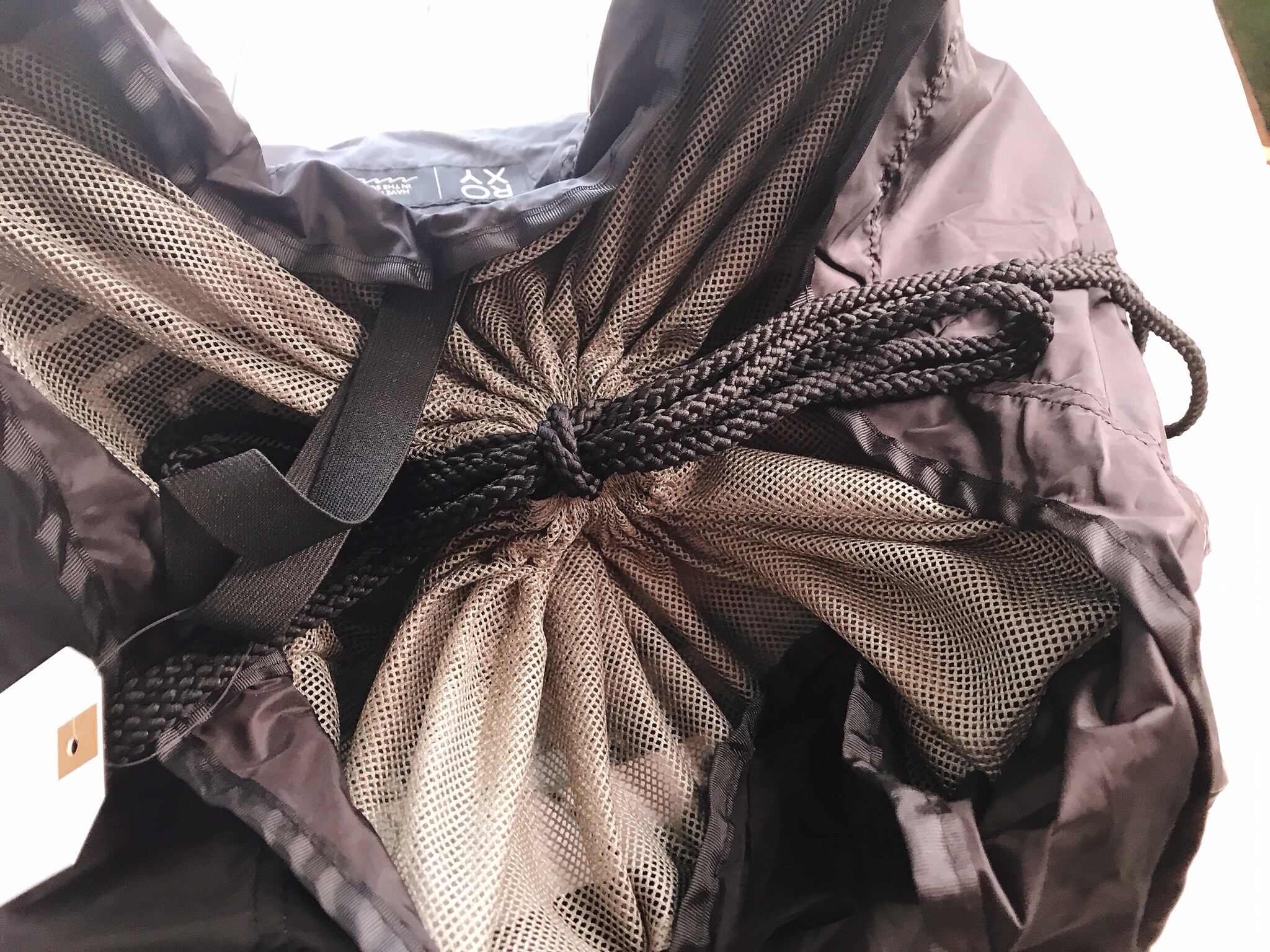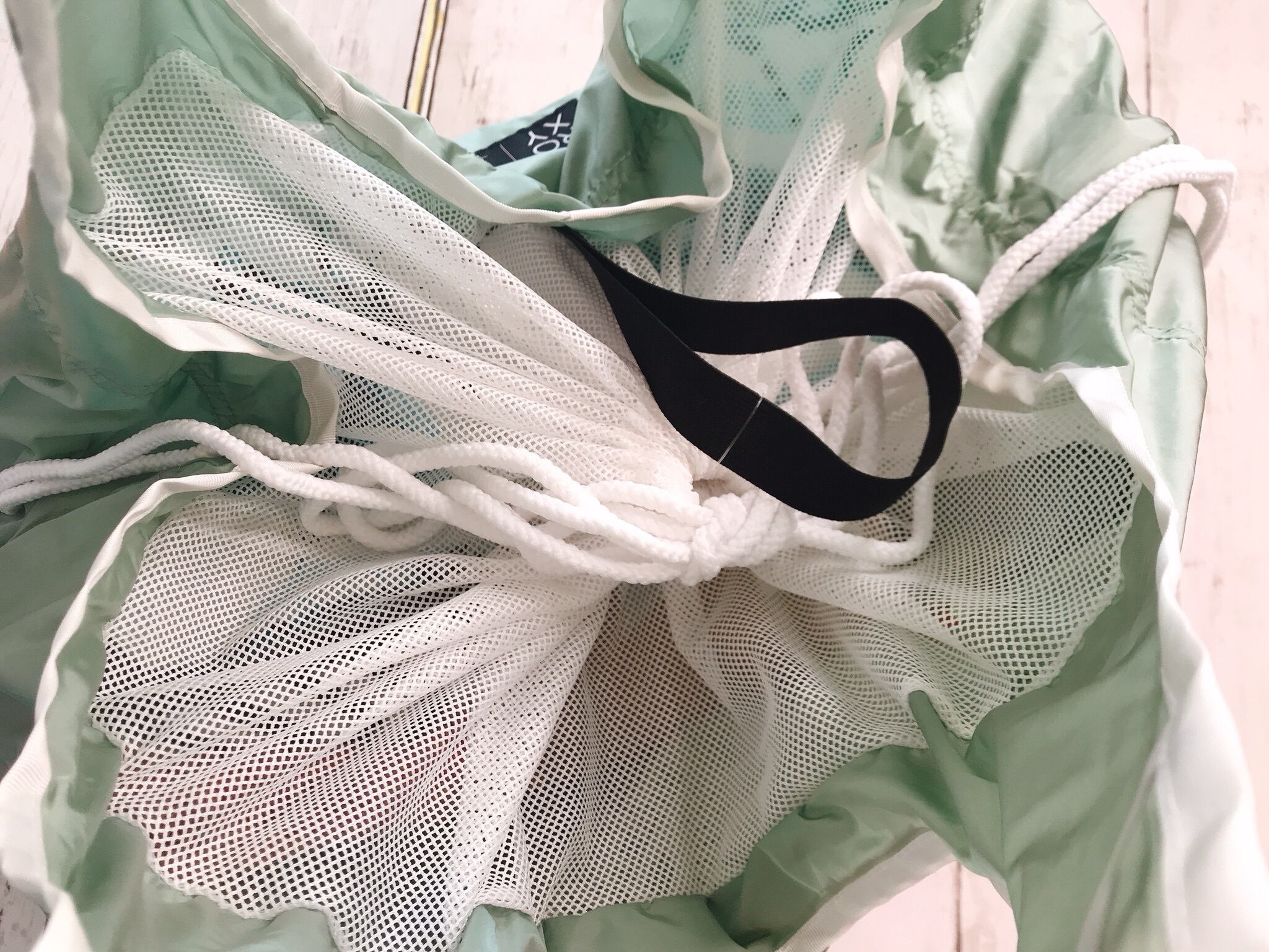 ・スーパーのレジカゴにもすっぽりはまるサイズで、口の部分はメッシュの巾着付き。